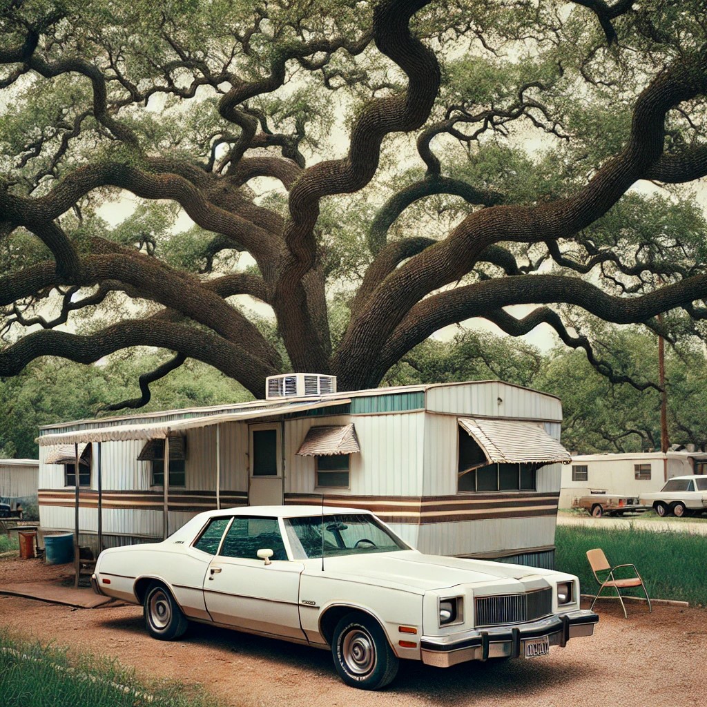 MOBILE HOME IN OAK HILL TEXAS WITH WHITE BUICK ELECTRA PARKED NEXT TO IT