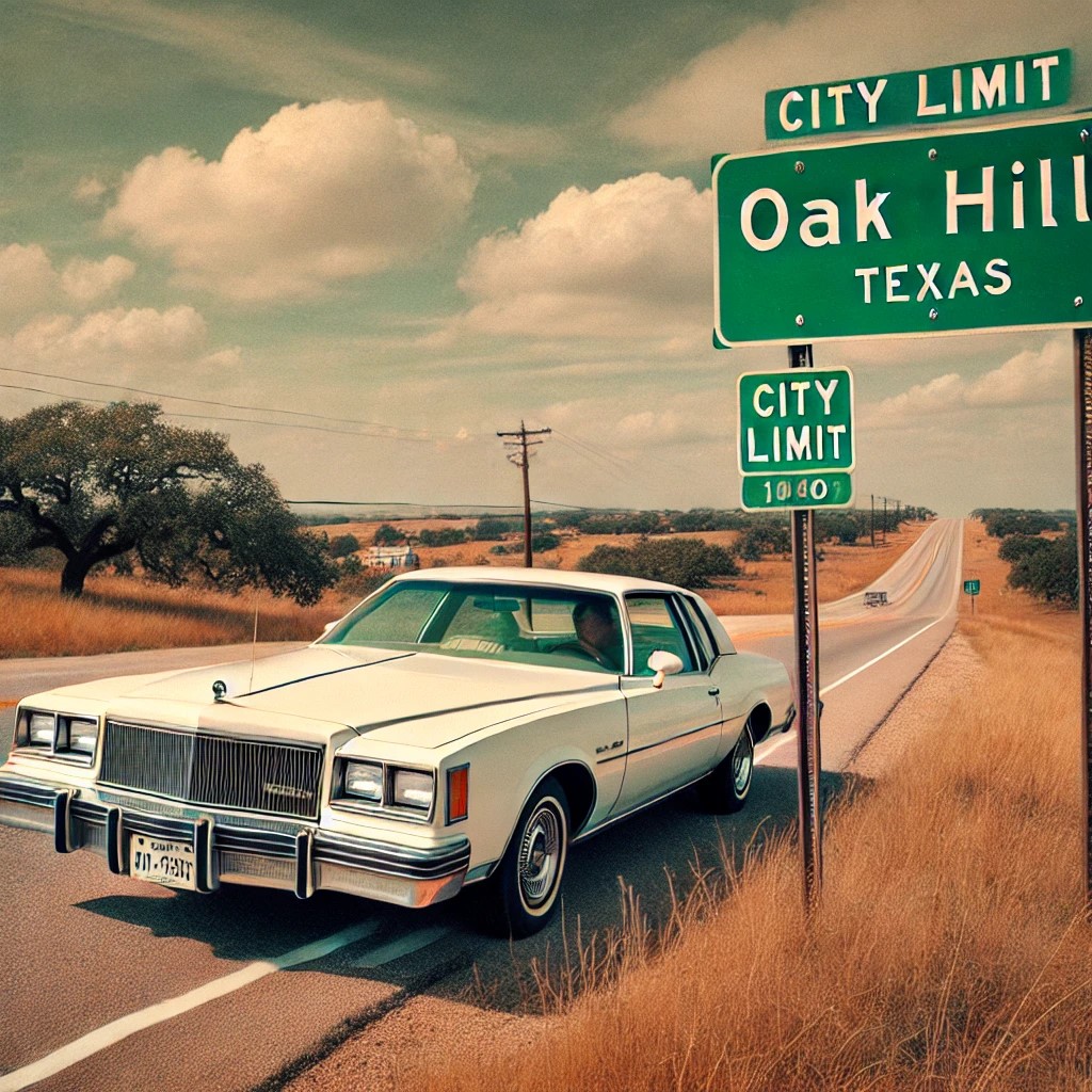 WHITE BUICK ELECTRA DRIVING PAST CITY LIMIT SIGN OF OAK HILL TEXAS 1980